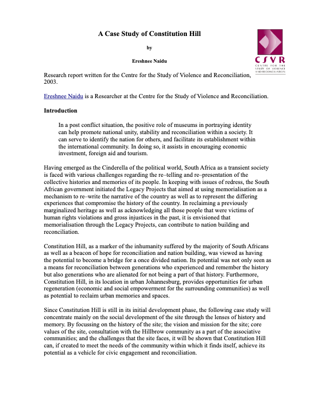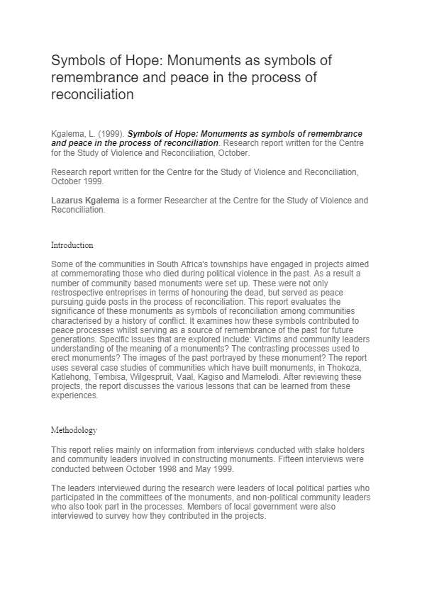 The following report is primarily a discussion document that seeks to record some of the initiatives that government, communities and civil society have engaged upon with regards to memorialization initiatives. In documenting these initiatives, the report highlights some of the…