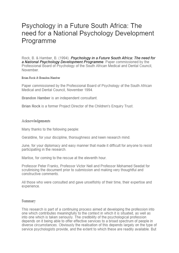 This research was part of a continuing process aimed at developing the psychological profession into one which contributes meaningfully to the context in which it is situated, as well as into one which is taken seriously. The credibility of the psychological profession depends on it being able to offer effective services to a broad spectrum of people in diverse circumstances.