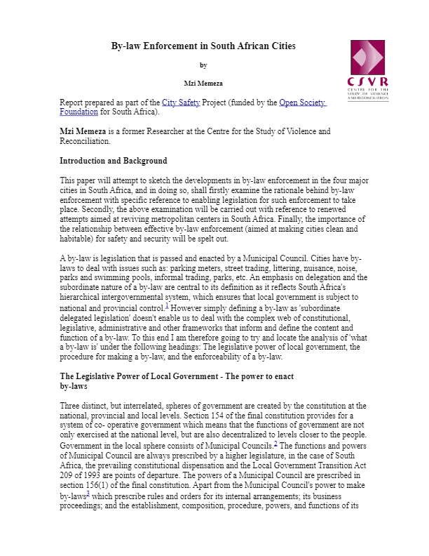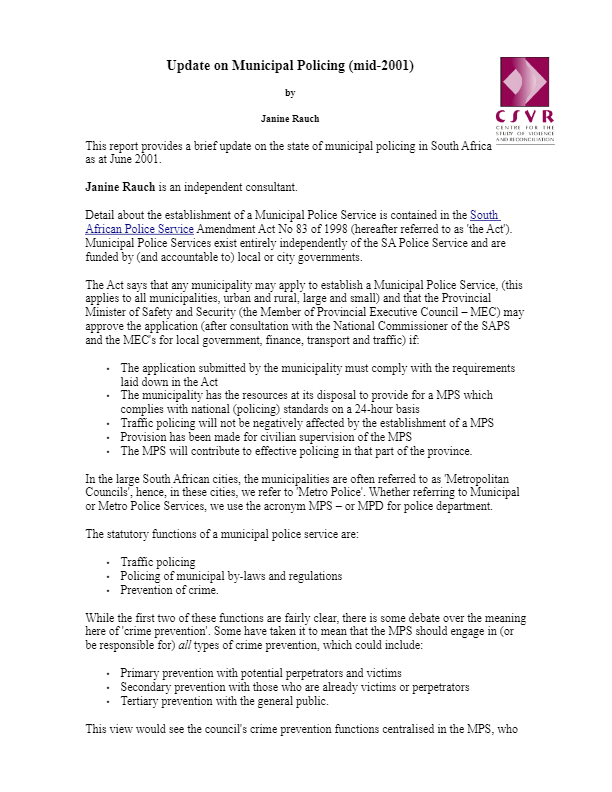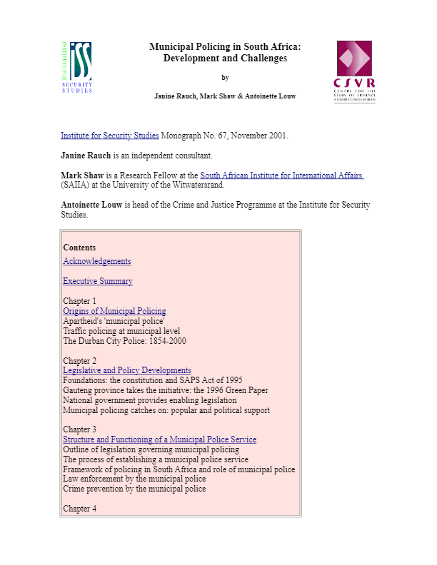 This report is part of a series of reports which document the role of local government in crime reduction in the six metropolitan cities in South Africa. The report gives a preliminary overview of the municipality's safety and security arrangements,…