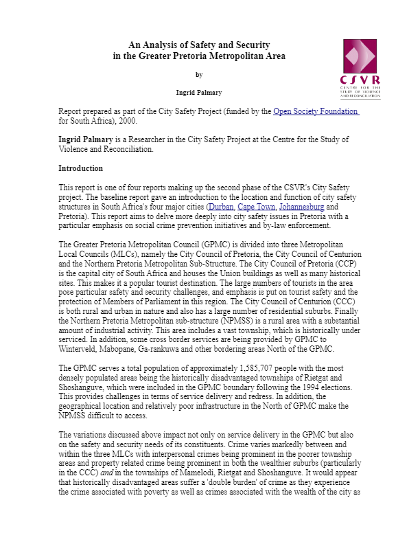 An Analysis Of Safety And Security In The Greater Pretoria Metropolitan Area